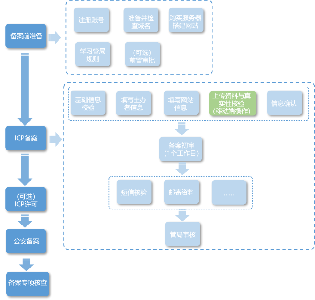 ICP备案前您需准备ICP备案所需的相关资料,通过PC端或App端进行备案信息填写、资料上传、真实性核验等,备案信息提交后需通过阿里云初审、短信核验和管局审核,整个备案流程预计所需时长约1~22个工作日左右,具体时长以实际操作时间为准。